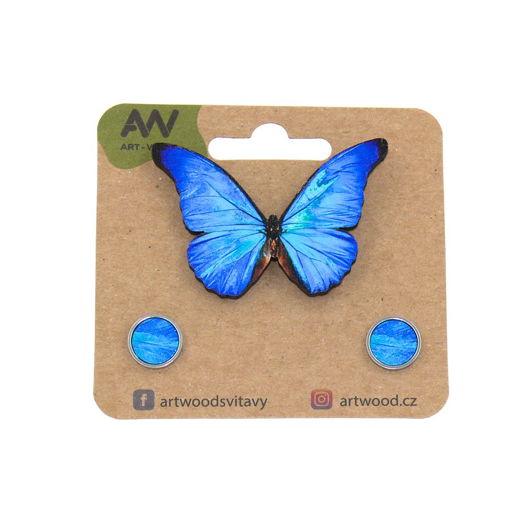 Dřevěná brož + náušnice kulaté - motýl MORPHO 2