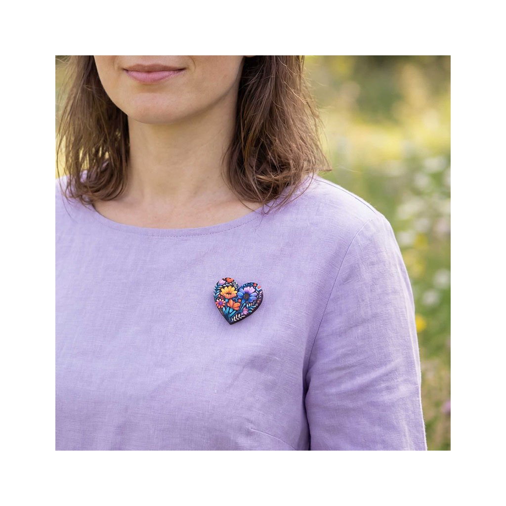 Dřevěná brož - srdce, florální příval