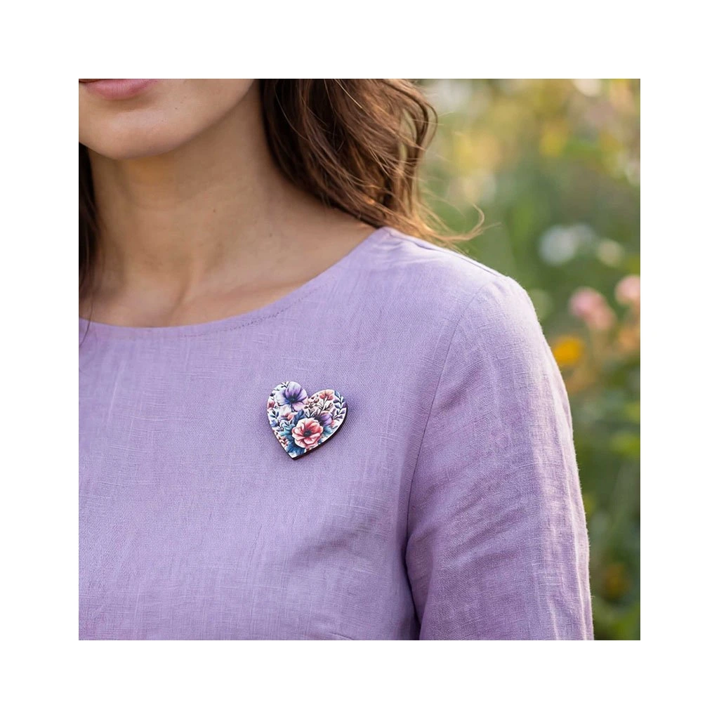 Dřevěná brož - srdce, jarní květ