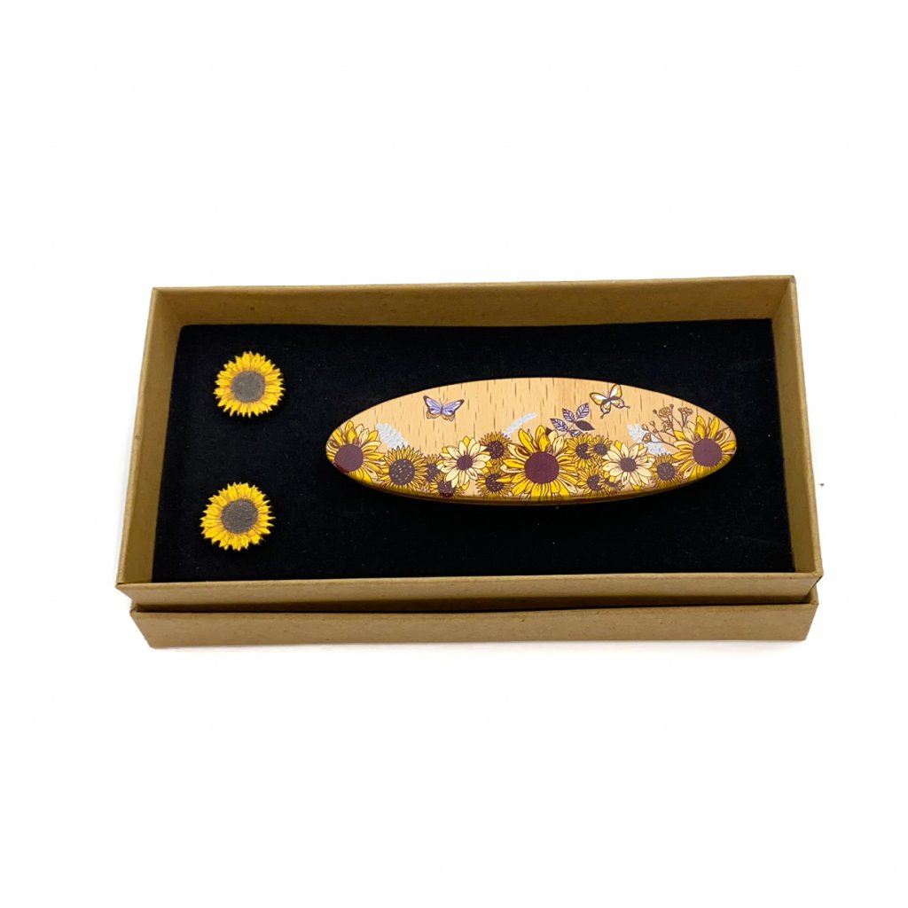 Dřevěná spona do vlasů + náušnice - slunečnice s motýly