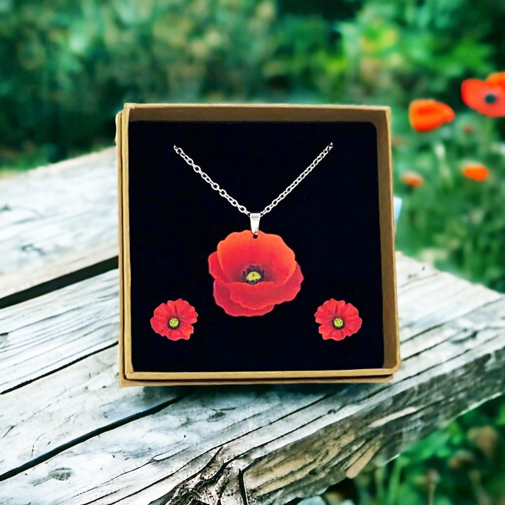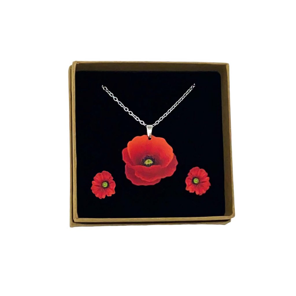 Dřevěný náhrdelník + náušnice - Vlčí máky