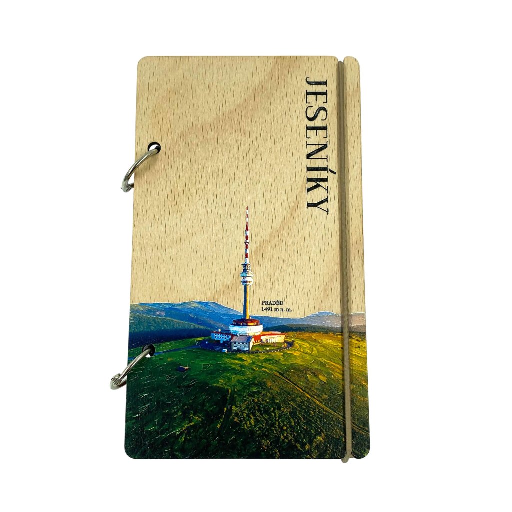 Zápisník Jeseníky v sobě nese klid a majestátnost moravských hor. Na obalu dominuje Praděd (1491 m n. m.), nejvyšší hora Jeseníků, známá svým ikonickým vysílačem a nekonečnými výhledy.