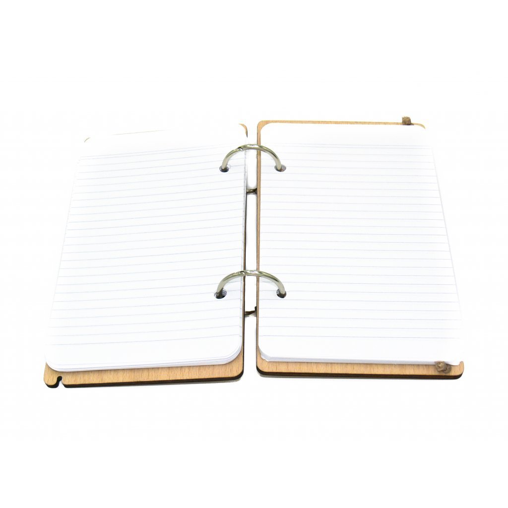 Každý zápisník je originál – z bukové překližky, která kombinuje eleganci s odolností. Kroužková vazba umožňuje snadné otáčení listů a gumička udržuje zápisník kompaktní při cestování.