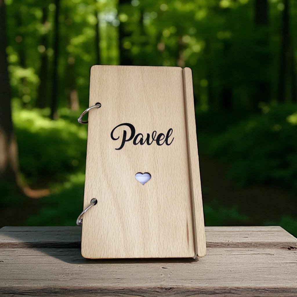 Ať si zapisujete zážitky, kreslíte, skicujete nebo skládáte básně – tenhle zápisník je tu právě pro vás. Vyrobíme vám ho s dřevěnými deskami a jménem přesně podle vašeho přání.