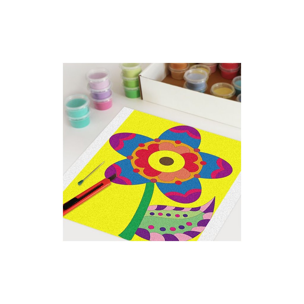 Obrázky vysypávané pískem je kreativní tvoření, které zaujme všechny generace svou jednoduchostí a nepřeberným množstvím barevných variant. Tvoření rozvíjí fantazii, barevné cítění a procvičuje jemnou motoriku prstů. Činnost může působit na uvolnění mysli, meditativně nebo relaxačně. Při tvoření v kolektivu působí pozitivně na týmový duch.Doplňkové parametry