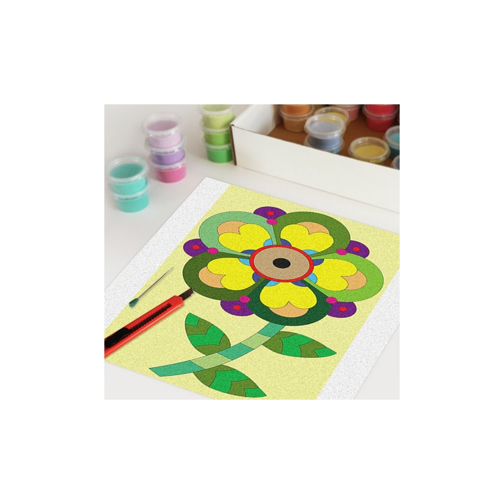 Obrázky vysypávané pískem je kreativní tvoření, které zaujme všechny generace svou jednoduchostí a nepřeberným množstvím barevných variant. Tvoření rozvíjí fantazii, barevné cítění a procvičuje jemnou motoriku prstů. Činnost může působit na uvolnění mysli, meditativně nebo relaxačně. Při tvoření v kolektivu působí pozitivně na týmový duch.Doplňkové parametry