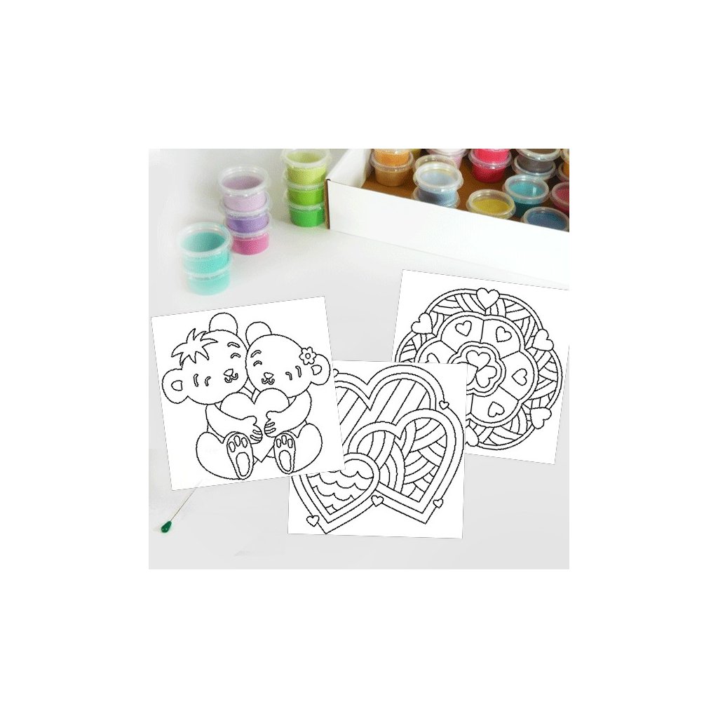 Unikátní tvořivá sada obrázků z barevného písku. Sada obsahuje:- 3 šablony obrázků 16 x 16 cm ( medvídci 1, srdíčka 3, srdíčka 4 )- 12ks barevných písků (po 13g)- vybrané přislušenství ZDARMA v rámci sady
