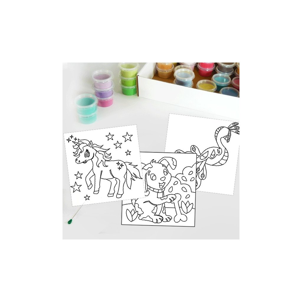 Unikátní tvořivá sada obrázků z barevného písku. Sada obsahuje:- 3 šablony obrázků 16 x 16 cm ( jednorožec, štěně, páv 2)- 12ks barevných písků (po 13g)- vybrané přislušenství ZDARMA v rámci sady