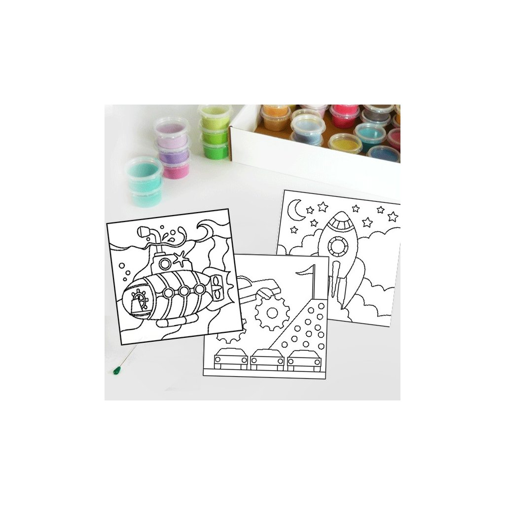 Unikátní tvořivá sada obrázků z barevného písku. Sada obsahuje:- 3 šablony obrázků 16 x 16 cm ( ponorka, raketa 3, monster truck )- 12ks barevných písků (po 13g)- vybrané přislušenství ZDARMA v rámci sady