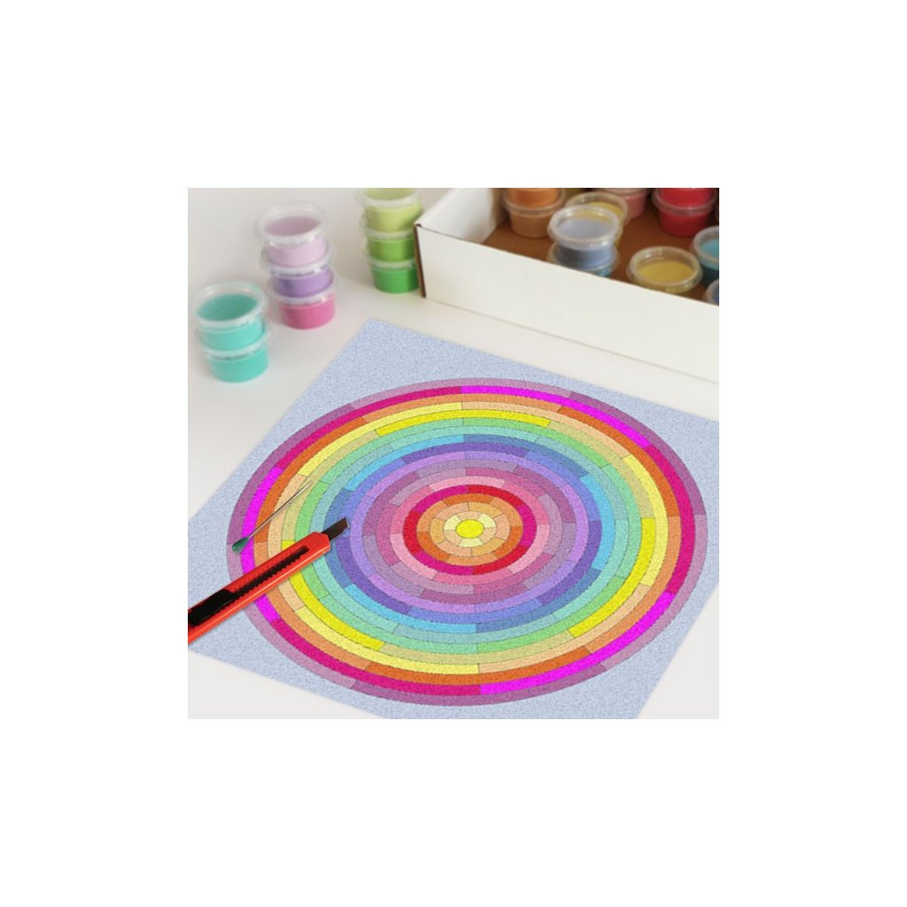 Obrázky vysypávané pískem je kreativní tvoření, které zaujme všechny generace svou jednoduchostí a nepřeberným množstvím barevných variant. Tvoření rozvíjí fantazii, barevné cítění a procvičuje jemnou motoriku prstů. Činnost může působit na uvolnění mysli, meditativně nebo relaxačně. Při tvoření v kolektivu působí pozitivně na týmový duch. Mandaly jsou velmi starou pomůckou při meditaci. V dnešní době je to nástroj pro relaxaci a sebepoznání. V mandalách se potkává barva (ženská energie) a tvar (mužská energie). To vše dohromady utváří harmonický celek nesoucí určitou energii, která během práce s obrazcem působí na duši člověka, který tvoří i na duši pozorovatele. Slovo mandala pochází ze sanskrtu a znamená kruh. Samotná mandala je nad kulturní symbol jednoty a rovnováhy vyskytující se ve všech dobách, kulturách i náboženstvích. Mandaly jsou staré jako lidstvo samo, což dokazuje i fakt, že nejstarší obrazce tohoto druhu se vyskytují už v paleolitu. Mandaly jsou všude kolem nás. Mandaly se dají najít také v půdorysu staveb ze starého Egypta, Babylónu a Jávy. V moderních dějinách je mandala dle posvátné geometrie (semeno života) půdorysem nejvyšší budovy světa v Dubaji.Doplňkové parametry