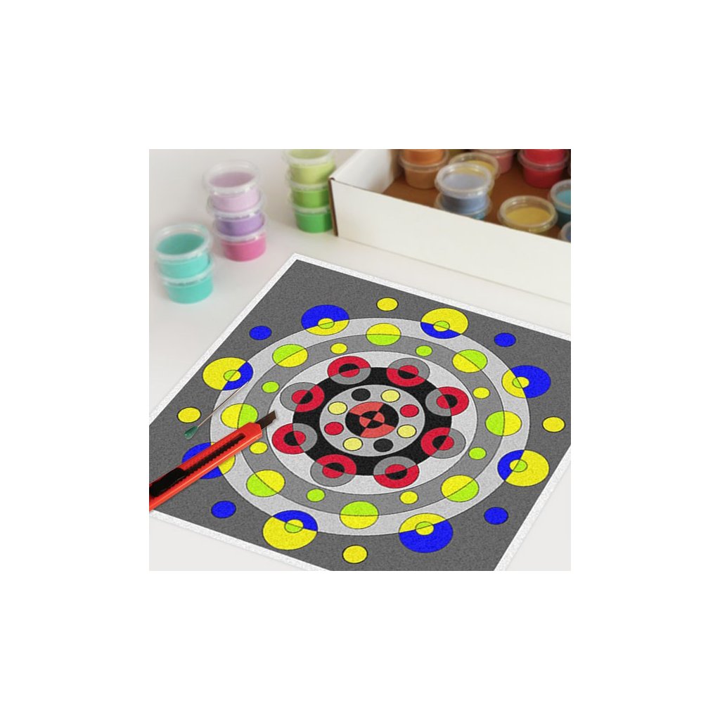 Obrázky vysypávané pískem je kreativní tvoření, které zaujme všechny generace svou jednoduchostí a nepřeberným množstvím barevných variant. Tvoření rozvíjí fantazii, barevné cítění a procvičuje jemnou motoriku prstů. Činnost může působit na uvolnění mysli, meditativně nebo relaxačně. Při tvoření v kolektivu působí pozitivně na týmový duch. Mandaly jsou velmi starou pomůckou při meditaci. V dnešní době je to nástroj pro relaxaci a sebepoznání. V mandalách se potkává barva (ženská energie) a tvar (mužská energie). To vše dohromady utváří harmonický celek nesoucí určitou energii, která během práce s obrazcem působí na duši člověka, který tvoří i na duši pozorovatele. Slovo mandala pochází ze sanskrtu a znamená kruh. Samotná mandala je nad kulturní symbol jednoty a rovnováhy vyskytující se ve všech dobách, kulturách i náboženstvích. Mandaly jsou staré jako lidstvo samo, což dokazuje i fakt, že nejstarší obrazce tohoto druhu se vyskytují už v paleolitu. Mandaly jsou všude kolem nás. Mandaly se dají najít také v půdorysu staveb ze starého Egypta, Babylónu a Jávy. V moderních dějinách je mandala dle posvátné geometrie (semeno života) půdorysem nejvyšší budovy světa v Dubaji.Doplňkové parametry