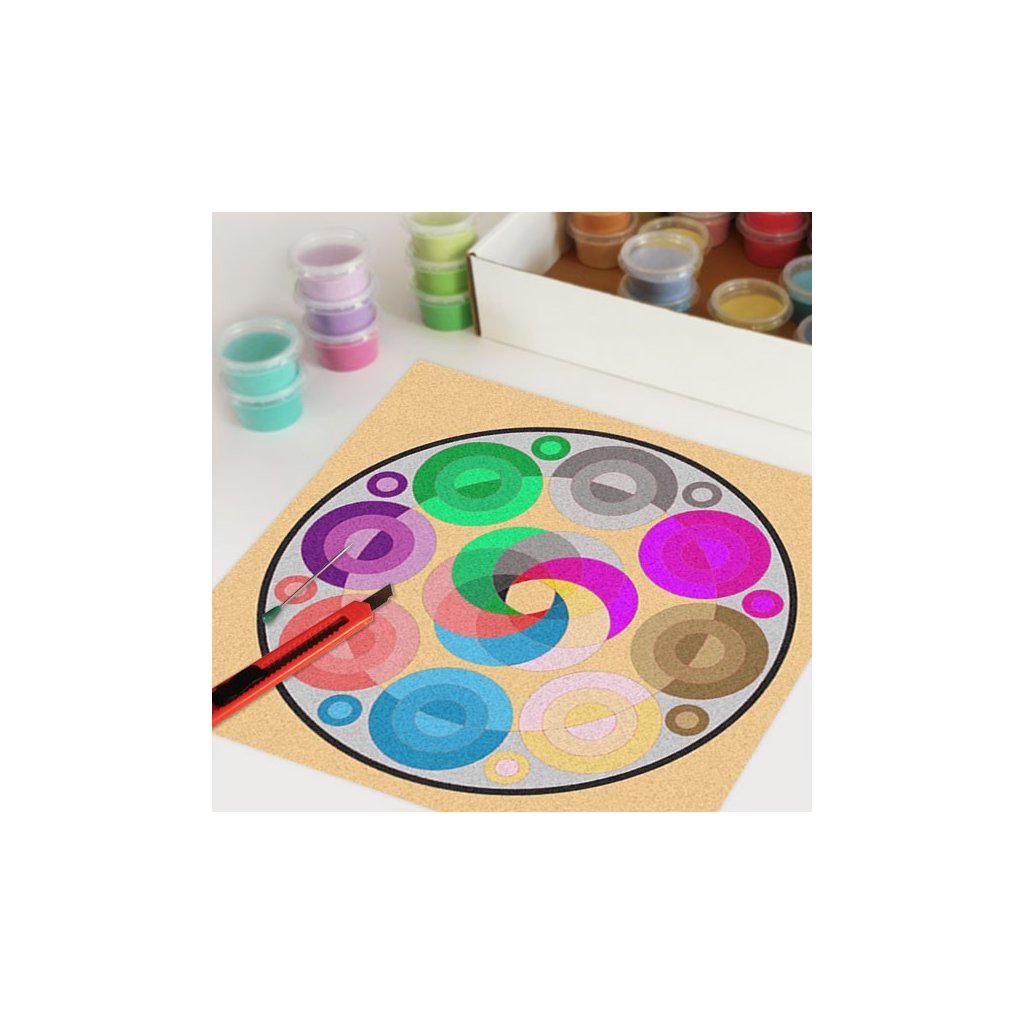 Obrázky vysypávané pískem je kreativní tvoření, které zaujme všechny generace svou jednoduchostí a nepřeberným množstvím barevných variant. Tvoření rozvíjí fantazii, barevné cítění a procvičuje jemnou motoriku prstů. Činnost může působit na uvolnění mysli, meditativně nebo relaxačně. Při tvoření v kolektivu působí pozitivně na týmový duch. Mandaly jsou velmi starou pomůckou při meditaci. V dnešní době je to nástroj pro relaxaci a sebepoznání. V mandalách se potkává barva (ženská energie) a tvar (mužská energie). To vše dohromady utváří harmonický celek nesoucí určitou energii, která během práce s obrazcem působí na duši člověka, který tvoří i na duši pozorovatele. Slovo mandala pochází ze sanskrtu a znamená kruh. Samotná mandala je nad kulturní symbol jednoty a rovnováhy vyskytující se ve všech dobách, kulturách i náboženstvích. Mandaly jsou staré jako lidstvo samo, což dokazuje i fakt, že nejstarší obrazce tohoto druhu se vyskytují už v paleolitu. Mandaly jsou všude kolem nás. Mandaly se dají najít také v půdorysu staveb ze starého Egypta, Babylónu a Jávy. V moderních dějinách je mandala dle posvátné geometrie (semeno života) půdorysem nejvyšší budovy světa v Dubaji.Doplňkové parametry