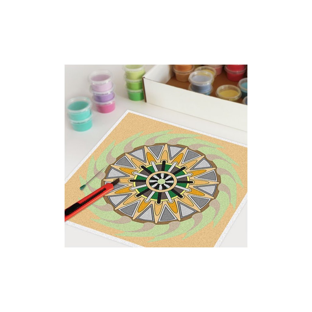 Obrázky vysypávané pískem je kreativní tvoření, které zaujme všechny generace svou jednoduchostí a nepřeberným množstvím barevných variant. Tvoření rozvíjí fantazii, barevné cítění a procvičuje jemnou motoriku prstů. Činnost může působit na uvolnění mysli, meditativně nebo relaxačně. Při tvoření v kolektivu působí pozitivně na týmový duch. Mandaly jsou velmi starou pomůckou při meditaci. V dnešní době je to nástroj pro relaxaci a sebepoznání. V mandalách se potkává barva (ženská energie) a tvar (mužská energie). To vše dohromady utváří harmonický celek nesoucí určitou energii, která během práce s obrazcem působí na duši člověka, který tvoří i na duši pozorovatele. Slovo mandala pochází ze sanskrtu a znamená kruh. Samotná mandala je nad kulturní symbol jednoty a rovnováhy vyskytující se ve všech dobách, kulturách i náboženstvích. Mandaly jsou staré jako lidstvo samo, což dokazuje i fakt, že nejstarší obrazce tohoto druhu se vyskytují už v paleolitu. Mandaly jsou všude kolem nás. Mandaly se dají najít také v půdorysu staveb ze starého Egypta, Babylónu a Jávy. V moderních dějinách je mandala dle posvátné geometrie (semeno života) půdorysem nejvyšší budovy světa v Dubaji.Doplňkové parametry