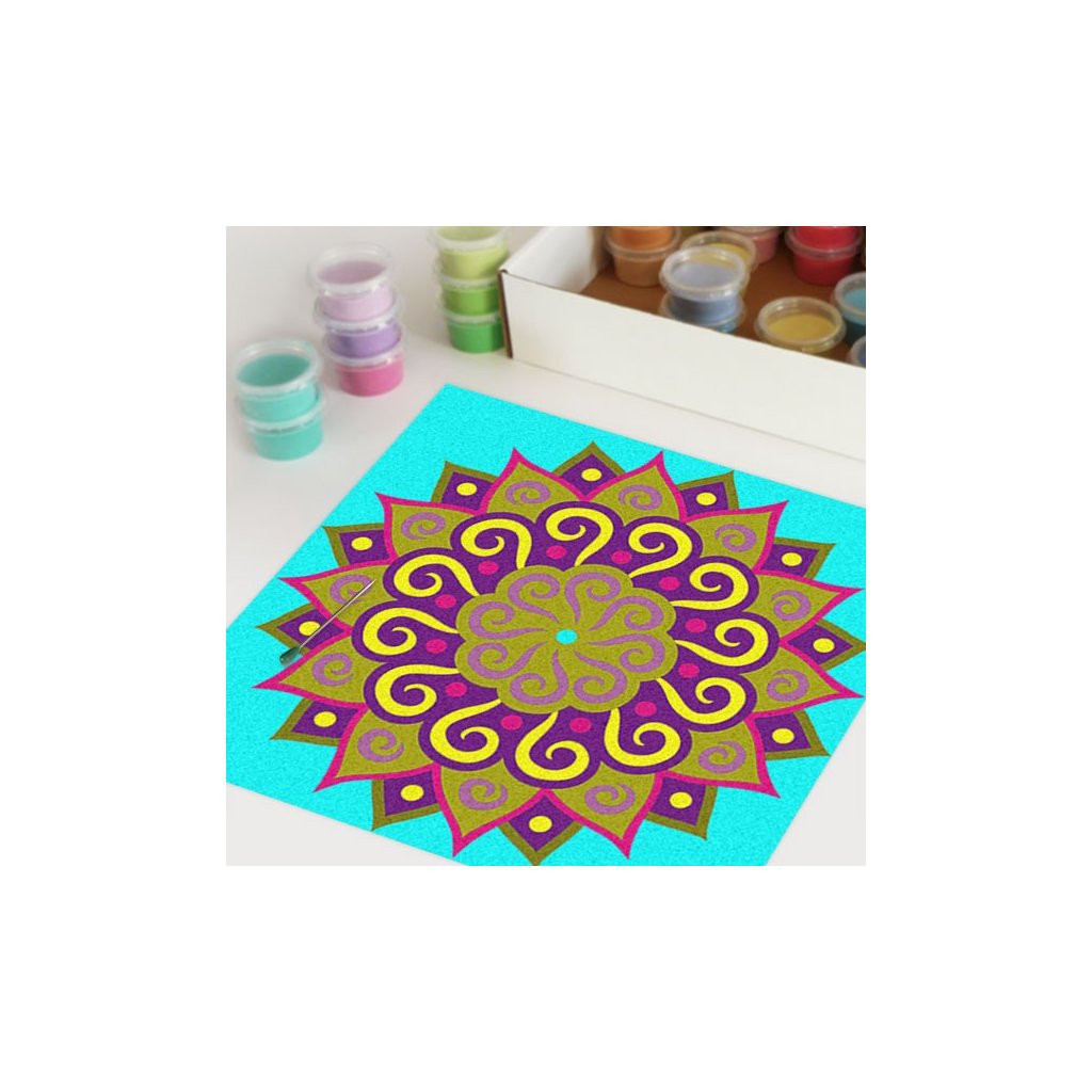 Obrázky vysypávané pískem je kreativní tvoření, které zaujme všechny generace svou jednoduchostí a nepřeberným množstvím barevných variant. Tvoření rozvíjí fantazii, barevné cítění a procvičuje jemnou motoriku prstů. Činnost může působit na uvolnění mysli, meditativně nebo relaxačně. Při tvoření v kolektivu působí pozitivně na týmový duch. Mandaly jsou velmi starou pomůckou při meditaci. V dnešní době je to nástroj pro relaxaci a sebepoznání. V mandalách se potkává barva (ženská energie) a tvar (mužská energie). To vše dohromady utváří harmonický celek nesoucí určitou energii, která během práce s obrazcem působí na duši člověka, který tvoří i na duši pozorovatele. Slovo mandala pochází ze sanskrtu a znamená kruh. Samotná mandala je nad kulturní symbol jednoty a rovnováhy vyskytující se ve všech dobách, kulturách i náboženstvích. Mandaly jsou staré jako lidstvo samo, což dokazuje i fakt, že nejstarší obrazce tohoto druhu se vyskytují už v paleolitu. Mandaly jsou všude kolem nás. Mandaly se dají najít také v půdorysu staveb ze starého Egypta, Babylónu a Jávy. V moderních dějinách je mandala dle posvátné geometrie (semeno života) půdorysem nejvyšší budovy světa v Dubaji.Doplňkové parametry