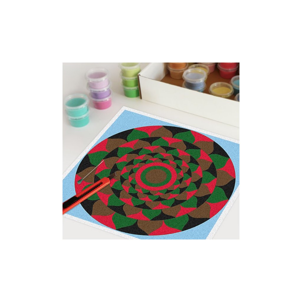 Obrázky vysypávané pískem je kreativní tvoření, které zaujme všechny generace svou jednoduchostí a nepřeberným množstvím barevných variant. Tvoření rozvíjí fantazii, barevné cítění a procvičuje jemnou motoriku prstů. Činnost může působit na uvolnění mysli, meditativně nebo relaxačně. Při tvoření v kolektivu působí pozitivně na týmový duch. Mandaly jsou velmi starou pomůckou při meditaci. V dnešní době je to nástroj pro relaxaci a sebepoznání. V mandalách se potkává barva (ženská energie) a tvar (mužská energie). To vše dohromady utváří harmonický celek nesoucí určitou energii, která během práce s obrazcem působí na duši člověka, který tvoří i na duši pozorovatele. Slovo mandala pochází ze sanskrtu a znamená kruh. Samotná mandala je nad kulturní symbol jednoty a rovnováhy vyskytující se ve všech dobách, kulturách i náboženstvích. Mandaly jsou staré jako lidstvo samo, což dokazuje i fakt, že nejstarší obrazce tohoto druhu se vyskytují už v paleolitu. Mandaly jsou všude kolem nás. Mandaly se dají najít také v půdorysu staveb ze starého Egypta, Babylónu a Jávy. V moderních dějinách je mandala dle posvátné geometrie (semeno života) půdorysem nejvyšší budovy světa v Dubaji.Doplňkové parametry