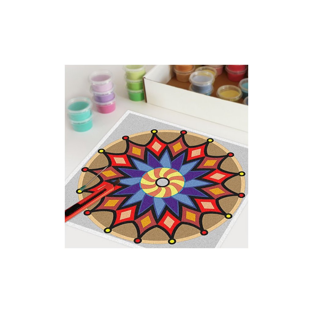 Obrázky vysypávané pískem je kreativní tvoření, které zaujme všechny generace svou jednoduchostí a nepřeberným množstvím barevných variant. Tvoření rozvíjí fantazii, barevné cítění a procvičuje jemnou motoriku prstů. Činnost může působit na uvolnění mysli, meditativně nebo relaxačně. Při tvoření v kolektivu působí pozitivně na týmový duch. Mandaly jsou velmi starou pomůckou při meditaci. V dnešní době je to nástroj pro relaxaci a sebepoznání. V mandalách se potkává barva (ženská energie) a tvar (mužská energie). To vše dohromady utváří harmonický celek nesoucí určitou energii, která během práce s obrazcem působí na duši člověka, který tvoří i na duši pozorovatele. Slovo mandala pochází ze sanskrtu a znamená kruh. Samotná mandala je nad kulturní symbol jednoty a rovnováhy vyskytující se ve všech dobách, kulturách i náboženstvích. Mandaly jsou staré jako lidstvo samo, což dokazuje i fakt, že nejstarší obrazce tohoto druhu se vyskytují už v paleolitu. Mandaly jsou všude kolem nás. Mandaly se dají najít také v půdorysu staveb ze starého Egypta, Babylónu a Jávy. V moderních dějinách je mandala dle posvátné geometrie (semeno života) půdorysem nejvyšší budovy světa v Dubaji.Doplňkové parametry