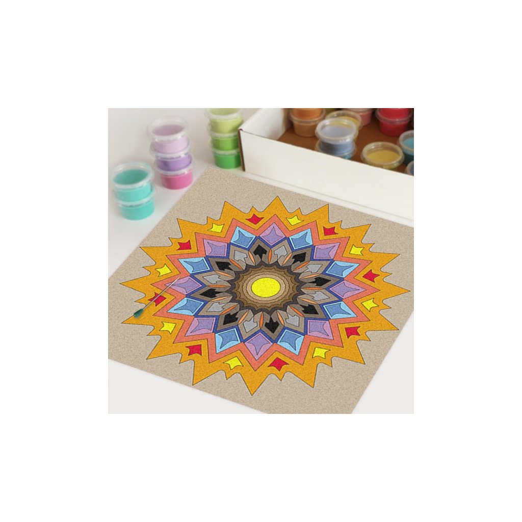 Obrázky vysypávané pískem je kreativní tvoření, které zaujme všechny generace svou jednoduchostí a nepřeberným množstvím barevných variant. Tvoření rozvíjí fantazii, barevné cítění a procvičuje jemnou motoriku prstů. Činnost může působit na uvolnění mysli, meditativně nebo relaxačně. Při tvoření v kolektivu působí pozitivně na týmový duch. Mandaly jsou velmi starou pomůckou při meditaci. V dnešní době je to nástroj pro relaxaci a sebepoznání. V mandalách se potkává barva (ženská energie) a tvar (mužská energie). To vše dohromady utváří harmonický celek nesoucí určitou energii, která během práce s obrazcem působí na duši člověka, který tvoří i na duši pozorovatele. Slovo mandala pochází ze sanskrtu a znamená kruh. Samotná mandala je nad kulturní symbol jednoty a rovnováhy vyskytující se ve všech dobách, kulturách i náboženstvích. Mandaly jsou staré jako lidstvo samo, což dokazuje i fakt, že nejstarší obrazce tohoto druhu se vyskytují už v paleolitu. Mandaly jsou všude kolem nás. Mandaly se dají najít také v půdorysu staveb ze starého Egypta, Babylónu a Jávy. V moderních dějinách je mandala dle posvátné geometrie (semeno života) půdorysem nejvyšší budovy světa v Dubaji.Doplňkové parametry
