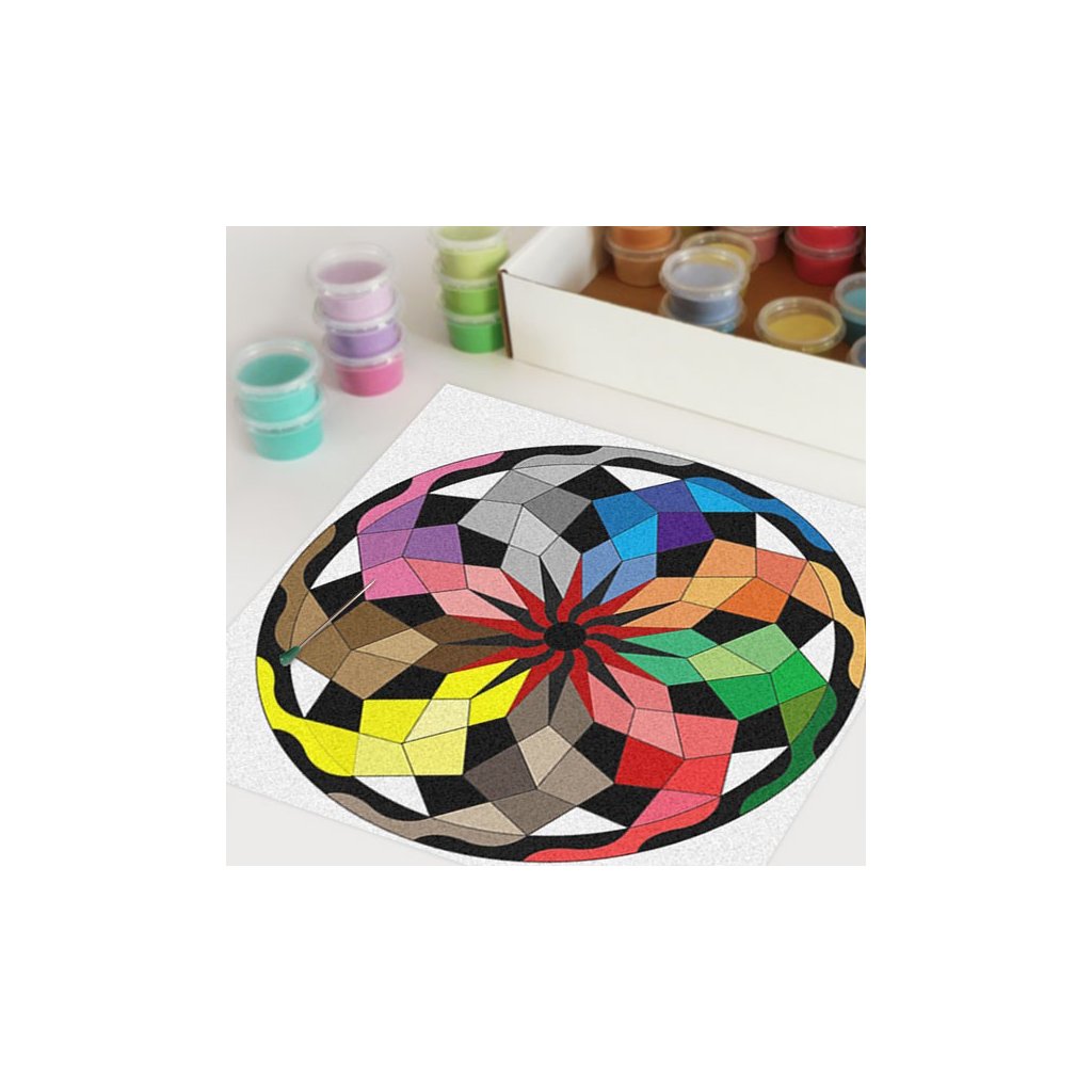 Obrázky vysypávané pískem je kreativní tvoření, které zaujme všechny generace svou jednoduchostí a nepřeberným množstvím barevných variant. Tvoření rozvíjí fantazii, barevné cítění a procvičuje jemnou motoriku prstů. Činnost může působit na uvolnění mysli, meditativně nebo relaxačně. Při tvoření v kolektivu působí pozitivně na týmový duch. Mandaly jsou velmi starou pomůckou při meditaci. V dnešní době je to nástroj pro relaxaci a sebepoznání. V mandalách se potkává barva (ženská energie) a tvar (mužská energie). To vše dohromady utváří harmonický celek nesoucí určitou energii, která během práce s obrazcem působí na duši člověka, který tvoří i na duši pozorovatele. Slovo mandala pochází ze sanskrtu a znamená kruh. Samotná mandala je nad kulturní symbol jednoty a rovnováhy vyskytující se ve všech dobách, kulturách i náboženstvích. Mandaly jsou staré jako lidstvo samo, což dokazuje i fakt, že nejstarší obrazce tohoto druhu se vyskytují už v paleolitu. Mandaly jsou všude kolem nás. Mandaly se dají najít také v půdorysu staveb ze starého Egypta, Babylónu a Jávy. V moderních dějinách je mandala dle posvátné geometrie (semeno života) půdorysem nejvyšší budovy světa v Dubaji.Doplňkové parametry