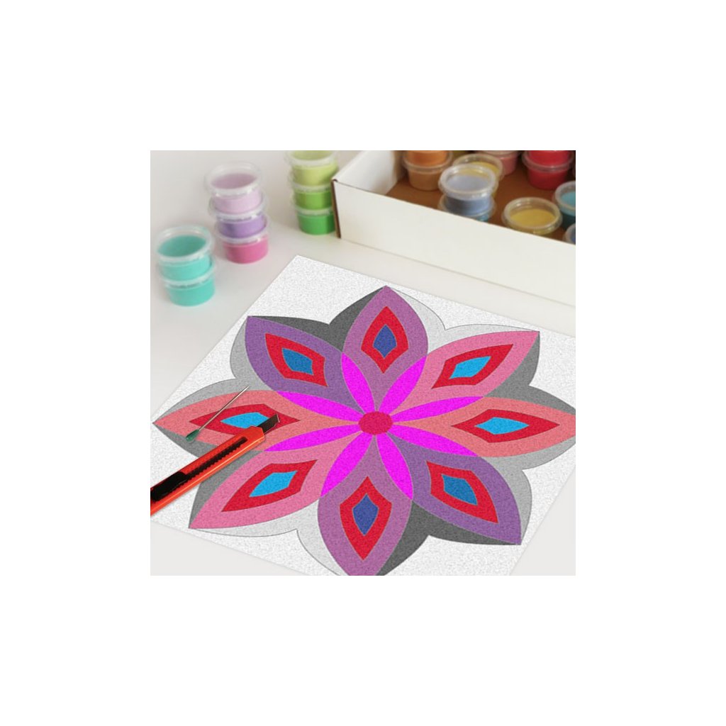 Obrázky vysypávané pískem je kreativní tvoření, které zaujme všechny generace svou jednoduchostí a nepřeberným množstvím barevných variant. Tvoření rozvíjí fantazii, barevné cítění a procvičuje jemnou motoriku prstů. Činnost může působit na uvolnění mysli, meditativně nebo relaxačně. Při tvoření v kolektivu působí pozitivně na týmový duch. Mandaly jsou velmi starou pomůckou při meditaci. V dnešní době je to nástroj pro relaxaci a sebepoznání. V mandalách se potkává barva (ženská energie) a tvar (mužská energie). To vše dohromady utváří harmonický celek nesoucí určitou energii, která během práce s obrazcem působí na duši člověka, který tvoří i na duši pozorovatele. Slovo mandala pochází ze sanskrtu a znamená kruh. Samotná mandala je nad kulturní symbol jednoty a rovnováhy vyskytující se ve všech dobách, kulturách i náboženstvích. Mandaly jsou staré jako lidstvo samo, což dokazuje i fakt, že nejstarší obrazce tohoto druhu se vyskytují už v paleolitu. Mandaly jsou všude kolem nás. Mandaly se dají najít také v půdorysu staveb ze starého Egypta, Babylónu a Jávy. V moderních dějinách je mandala dle posvátné geometrie (semeno života) půdorysem nejvyšší budovy světa v Dubaji.Doplňkové parametry