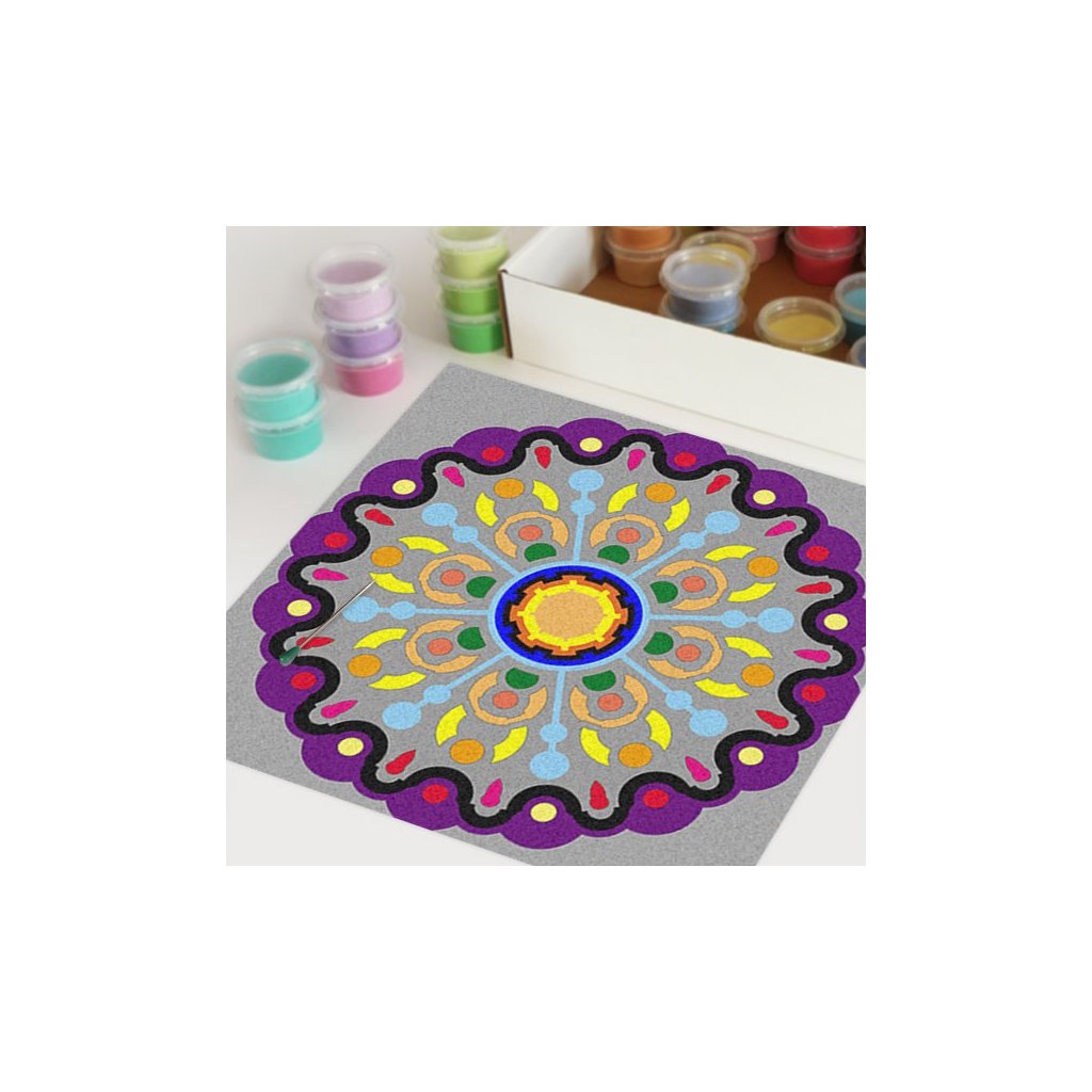 Obrázky vysypávané pískem je kreativní tvoření, které zaujme všechny generace svou jednoduchostí a nepřeberným množstvím barevných variant. Tvoření rozvíjí fantazii, barevné cítění a procvičuje jemnou motoriku prstů. Činnost může působit na uvolnění mysli, meditativně nebo relaxačně. Při tvoření v kolektivu působí pozitivně na týmový duch. Mandaly jsou velmi starou pomůckou při meditaci. V dnešní době je to nástroj pro relaxaci a sebepoznání. V mandalách se potkává barva (ženská energie) a tvar (mužská energie). To vše dohromady utváří harmonický celek nesoucí určitou energii, která během práce s obrazcem působí na duši člověka, který tvoří i na duši pozorovatele. Slovo mandala pochází ze sanskrtu a znamená kruh. Samotná mandala je nad kulturní symbol jednoty a rovnováhy vyskytující se ve všech dobách, kulturách i náboženstvích. Mandaly jsou staré jako lidstvo samo, což dokazuje i fakt, že nejstarší obrazce tohoto druhu se vyskytují už v paleolitu. Mandaly jsou všude kolem nás. Mandaly se dají najít také v půdorysu staveb ze starého Egypta, Babylónu a Jávy. V moderních dějinách je mandala dle posvátné geometrie (semeno života) půdorysem nejvyšší budovy světa v Dubaji.Doplňkové parametry