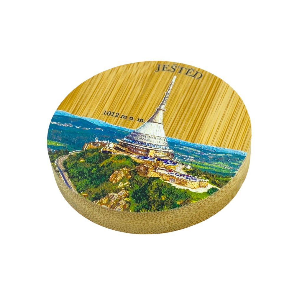 Je vyroben z přírodního bambusu, zdoben motivem jedné z ikonických českých hor ve fotograficko-malířském stylu, a ze zadní strany vybaven silnými magnety, díky kterým vždy čeká po ruce – na lednici, na chatě, v kuchyni nebo v dílně.